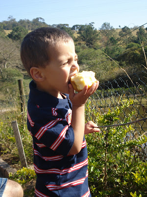 Pausa para a maçã! O percurso é longo, mais de 2 horas, sem contar as trilhas na mata...